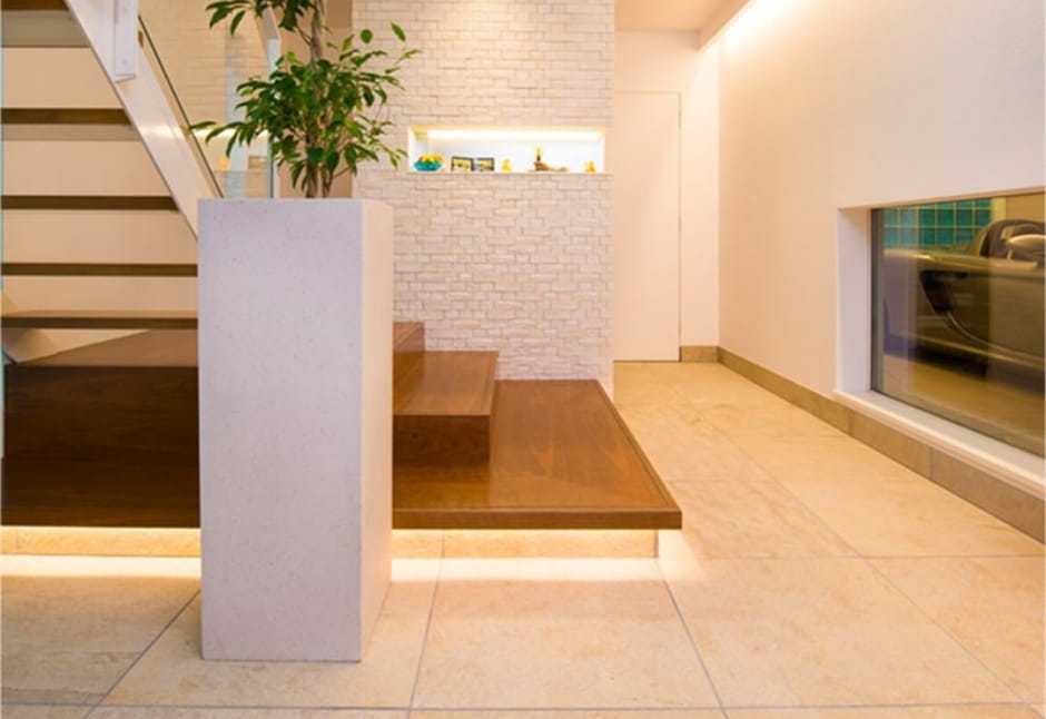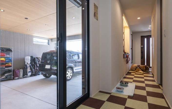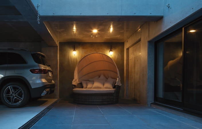 それぞれの世帯が快適に過ごせることに加えてK様が重視したのが、インナーガレージです。所有する5台の車を格納し、ご自身が愛車を眺めながらくつろぐことができるソファスペースを確保。床の目地のつながりまでこだわってデザインした空間は、まるでショールームのような雰囲気に仕上がっています。